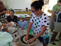 阿用寿会の女性部のみなさんの指導を受けながら、だんごをこね、それを食べやすいように丸めて串を通して、はだこをかぶせ、それに笹の葉3〜4枚で巻いていきました。